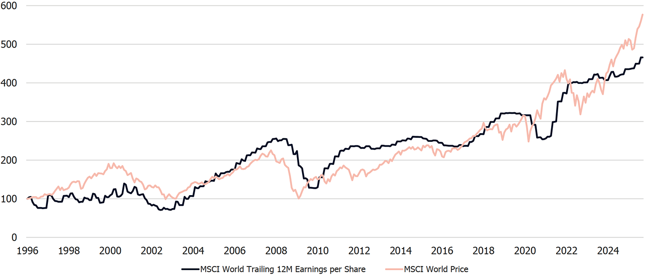 Source: Bloomberg, MSCI, 30 September 2025. MSCI World EPS and Price in USD rebased to 100 on 31 January 1996. Past performance is not a guide to future performance and returns may also increase or decrease as a result of currency fluctuations. Please refer to the appendix for important information.